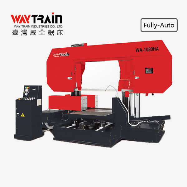 • WA-7062HA 雙柱式全自動帶鋸機 觸控螢幕及九種切削工作設定 油壓鋸帶張力裝置 油壓馬達自動鐵屑輸送裝置 油壓鋸帶張力夾持裝置 變頻器控制鋸帶無段變速 油壓式前培林支架移動及定位 重型切削帶鋸機 高切